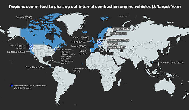 Several countries worldwide are adopting the net zero emission approach and have committed to phase out all new sales of internal combustion engine vehicles over the next few decades.